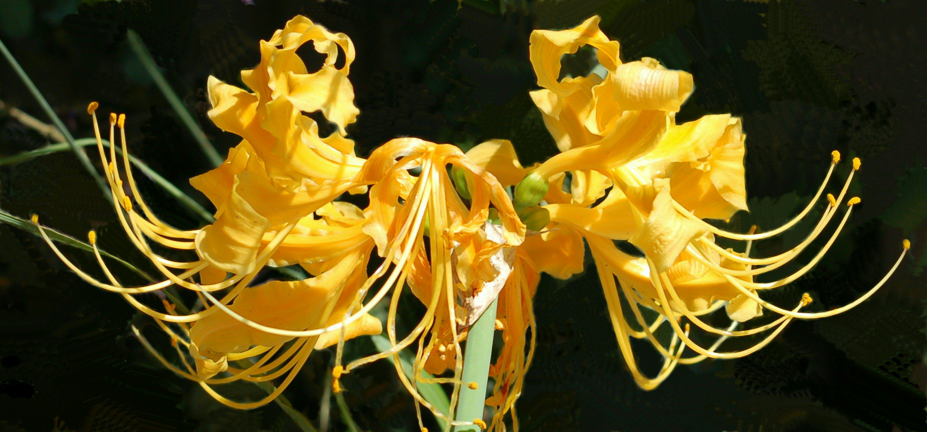 目の覚めるような黄色い花です。隣家のお庭に咲いていましたので、写真を撮らせて貰い、球根まで頂きました。この花はショウキズイセン(鐘馗水仙 Lycoris traubii)です。リコリスは一般に夏、ピンク色の花を付ける夏水仙のことを言いますが、この黄色の花を咲かせる種類は秋のお彼岸、ヒガンバナ(Lycoris radiata)と同じ頃にに咲き、花の付き方(散形花序)や雄蕊の形などが同じなので黄色いヒガンバナとも呼ばれているようです。しかし、厳密には二つは同じ属ながら種の異なる植物です。ヒガンバナの花は花弁が細く大抵は真っ赤で、自然界での色変わりとしては白いのを見かけることがあります。黄色はありません。