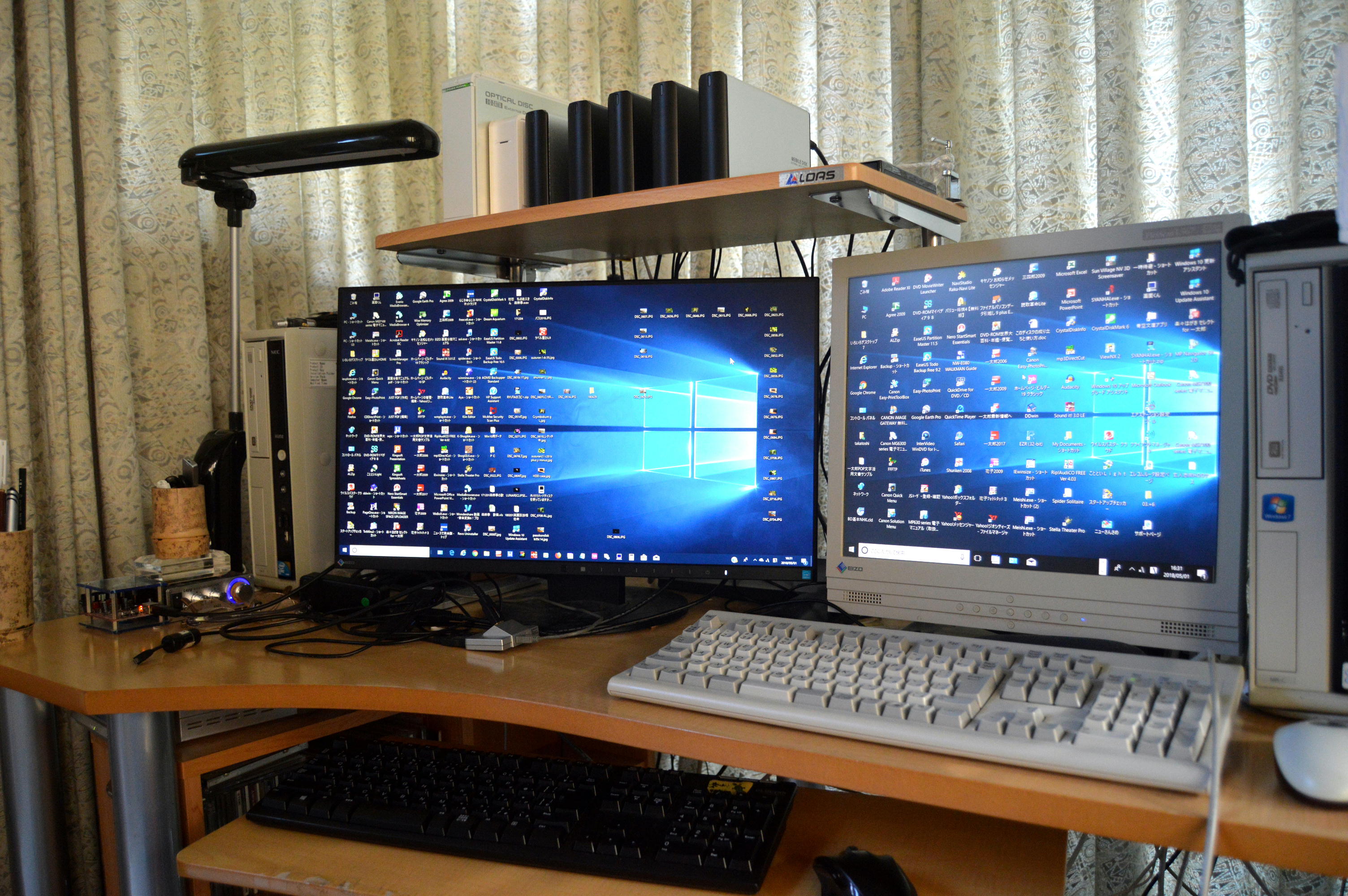 メインのパソコン(HP)はデスクの左下に置いてありますので写真では見えません。デスク上の左右にあるビジネスパソコン(NEC)はどちらも数年前の非力な機種なので、今は両方とも予備機として置いてあり、右側の古いEIZOのディスプレイにはこの二台が繋がっています。左側、23.8 インチのメインマシン用ディスプレイもEIZOです。画面は優しく、しかもかっこいい。